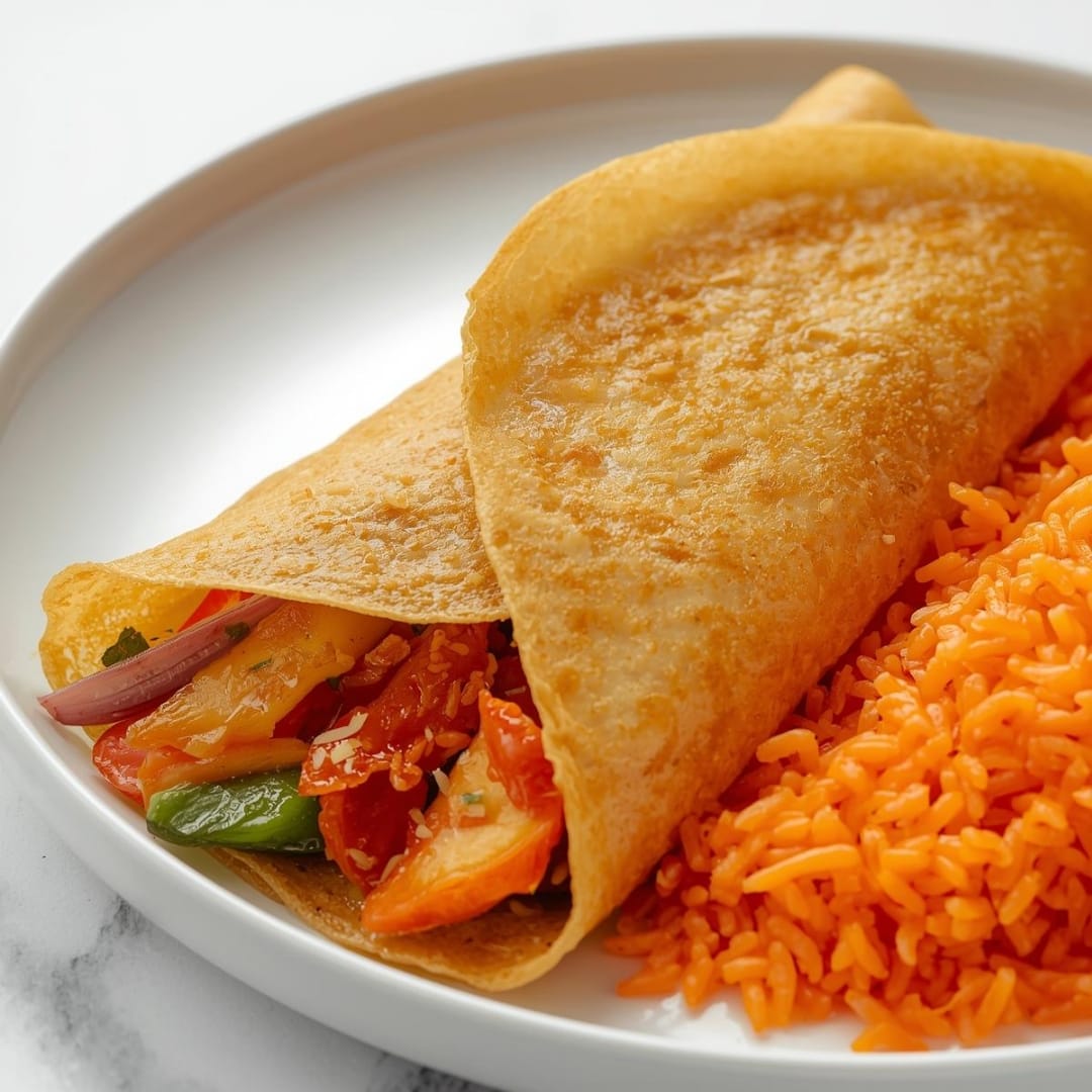 Crepes finos recheados com legumes salteados, acompanhados por arroz de cenoura leve e aromático.