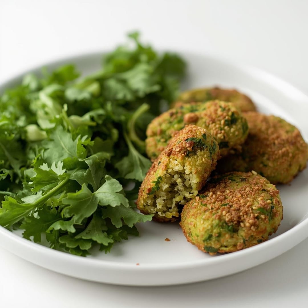 Croquetes preparados com brócolos picados e massa leve, fritos até ficarem dourados, servidos com salada fresca.