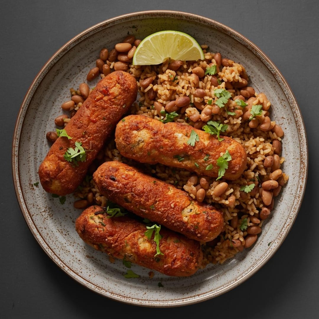 Croquetes feitos com uma mistura de quinoa e feijão preto, servidos com arroz selvagem para um prato cheio de textura e proteína vegetal.