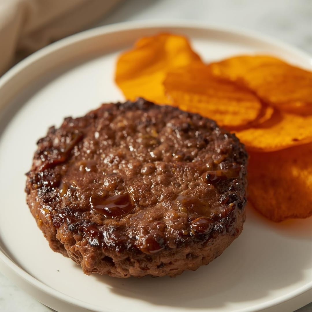 Hambúrguer de carne grelhado, suculento e bem temperado, servido com chips de batata doce assadas até ficarem ligeiramente crocantes.