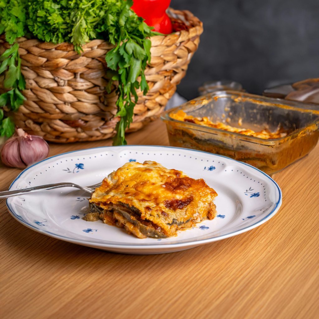 Lasanha de carne gratinada, em camadas de massa, molho de tomate e bechamel cremoso. Conforto total num só prato.
